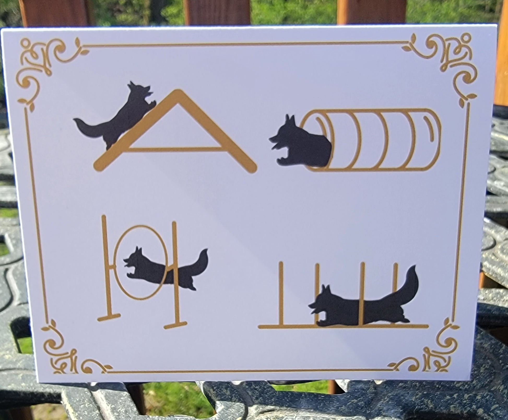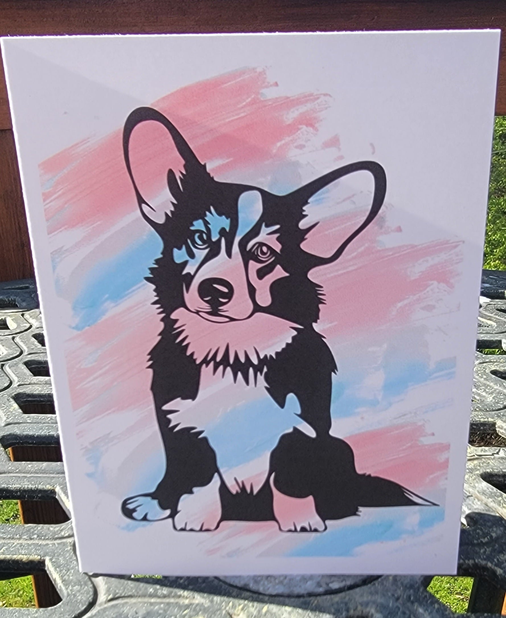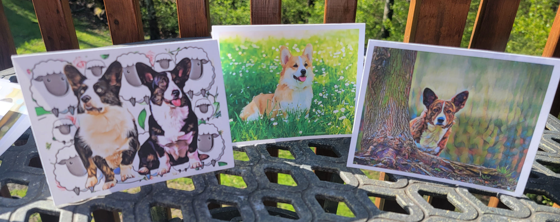 5 note cards with envelopes. Choose from Classic which includes the 5 cards pictured below, or choose the whimsical pack which includes the birthday, bubble bath, 4 corgi pop art, sheep, blue merle with purple flowers.